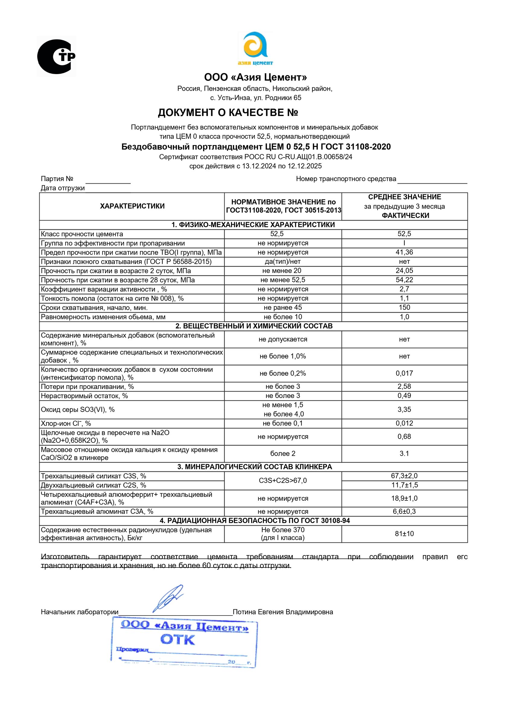 Портландцемент без вспомогательных компонентов и минеральных добавок типа ЦЕМ0 класса прочности 52,5, нормальнотвердеющий