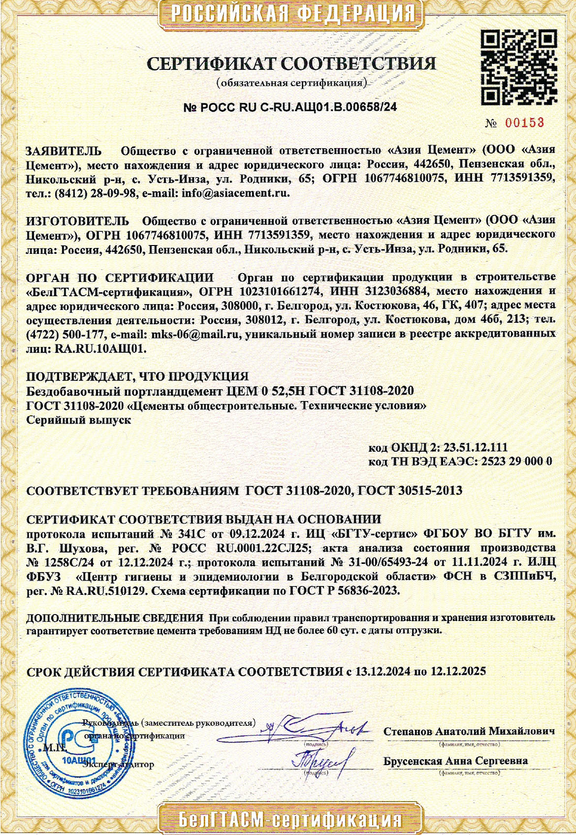 Производится на основе портландцементного клинкера нормированного химико-минералогического состава без использования вспомогательных компонентов